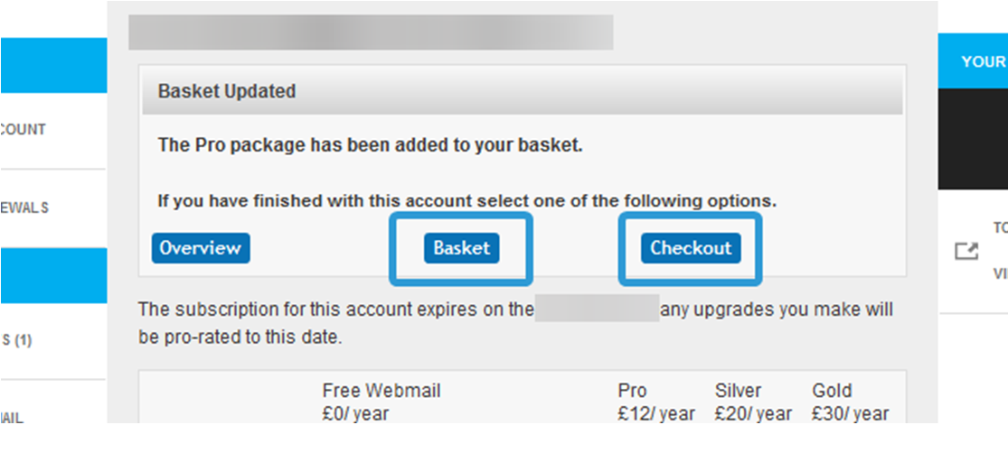Once selected, the Packages and Bolt-Ons will be added to your Basket. You can click on Basket or Checkout to view details of the upgrades you have selected and continue with upgrading your Account.